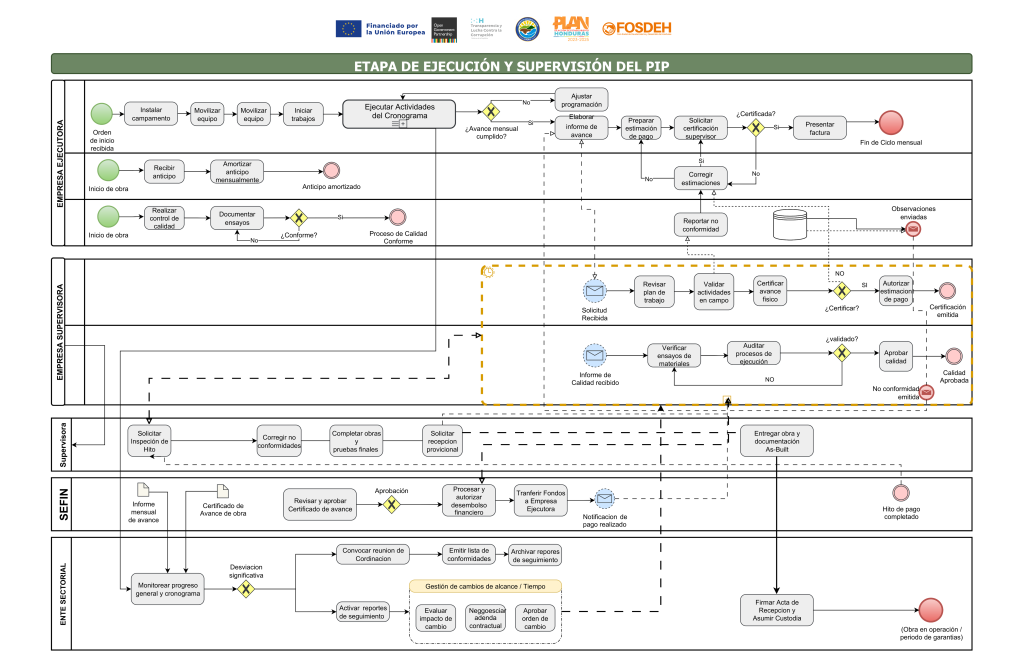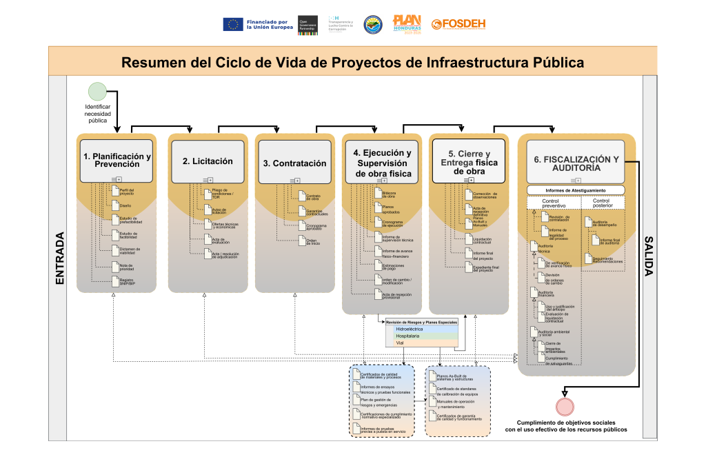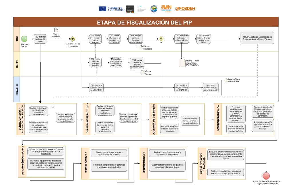En esta fase, instituciones como el Tribunal Superior de Cuentas (TSC), la Secretaría de Finanzas (SEFIN) y la Oficina Nacional de Auditoría Interna y Control Institucional (ONADICI) articulan auditorías técnicas, financieras y de desempeño. Estas revisiones analizan el cumplimiento de obligaciones contractuales, las evaluaciones y certificaciones técnicas, los costos finales y ajustes presupuestarios, el uso de los fondos públicos, la correcta gestión de garantías, así como la necesidad de auditorías especiales en proyectos de mayor riesgo.