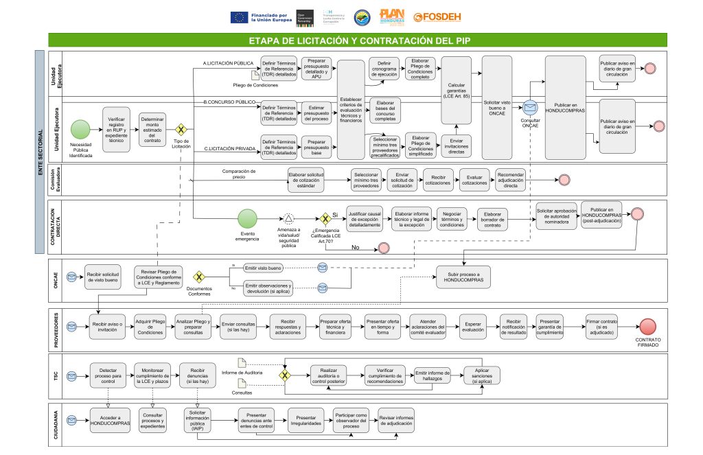 En esta fase se desarrollan procesos clave como la elección del tipo de procedimiento (licitación pública, concurso público, licitación privada o contratación directa), la elaboración de pliegos y términos de referencia (TDR), la publicación en HONDUCOMPRAS, la recepción de ofertas, la evaluación técnica y financiera, y finalmente la adjudicación y formalización del contrato. También intervienen comisiones evaluadoras, oferentes y entes de control, lo que exige transparencia y trazabilidad en cada paso.