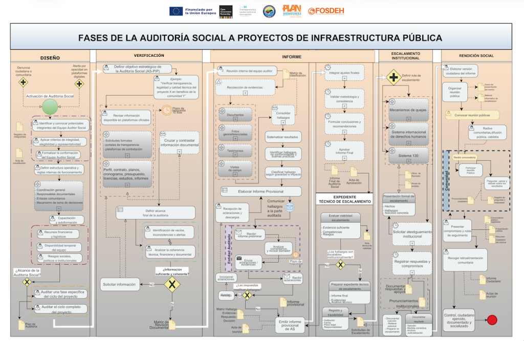 El diagrama que compartimos forma parte del Protocolo para la Auditoría Social a Proyectos de Infraestructura Pública (AS-PIP) y organiza la metodología en fases claras y articuladas: Diseño, Verificación, Informe, Escalamiento institucional, Rendición social.