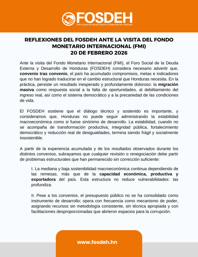 Ante la visita del Fondo Monetario Internacional (FMI), el Foro Social de la Deuda Externa y Desarrollo de Honduras (FOSDEH) considera necesario advertir que, convenio tras convenio, el país ha acumulado compromisos, metas e indicadores que no han logrado traducirse en el cambio estructural que Honduras necesita. En la práctica, persiste un resultado inesperado y […]